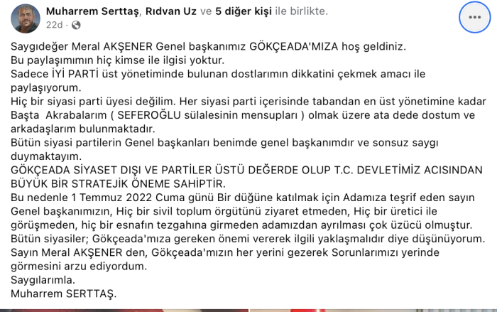 “Saygıdeğer Meral AKŞENER Genel başkanımız GÖKÇEADA'MIZA hoş geldiniz.