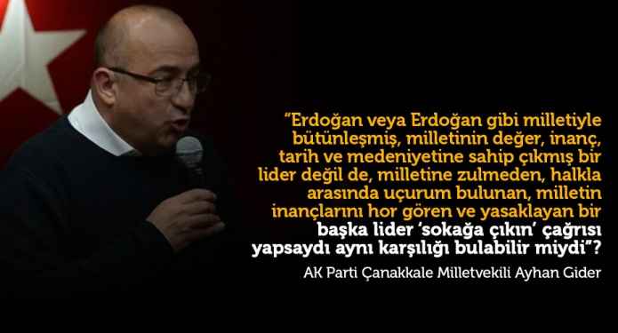 AK Parti Çanakkale Milletvekili Ayhan Gider; “15 Temmuz 2016’da ise millet seçtiği ve peşinden gittiği lidere baktı. Erdoğan, teslim olmayacağını söyledi, kendisi de dahil milleti direnişe çağırdı. Millet O liderin samimiyetine güvenerek tereddüt etmeden meydanlara aktı. Şayet Erdoğan veya Erdoğan gibi milletiyle bütünleşmiş, milletinin değer, inanç, tarih ve medeniyetine sahip çıkmış bir lider değil de, milletine zulmeden, halkla arasında uçurum bulunan, milletin inançlarını hor gören ve yasaklayan bir başka lider ‘sokağa çıkın’ çağrısı yapsaydı aynı karşılığı bulabilir miydi? Bu soruya ‘evet’ demek imkansız.” Dedi.