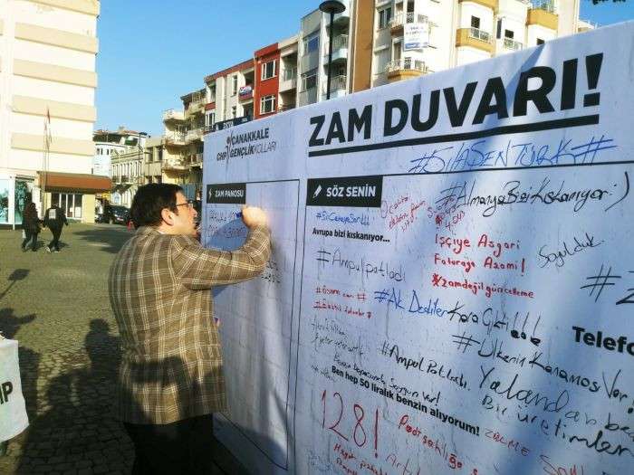 Çanakkale Belediye Başkanı Ülgür Gökhan da, “Zam Duvarı eylemine katılarak, son günlerde elektriğe, yakıta gelen zamların geri alınması talebinde bulunduk” diye konuştu.