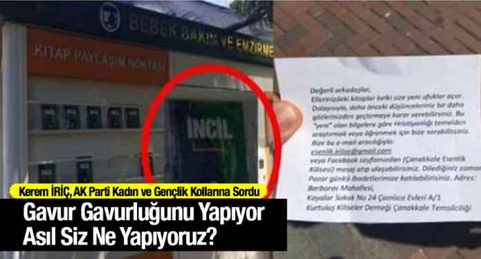 Çanakkale Barosu ve belediyenin ortak projesi olan şehrin çeşitli noktalarında bulunan bebek emzirme kabinlerinin dışındaki kitaplıklara misyonerlik faaliyetleri kapsamında İncil bırakmışlar. Konu haber olmuş ve belediyeye “çakmak” için müthiş bir fırsatı daha elde etmiştik! Ne mi yaptık konuyu sosyal medyada eleştirdik, yerin dinine soktuk yöneticileri ve vicdanlarımızı rahatlattık bu mudur elimizden gelen? Herkese açık olan o kitap raflarını birileri kendi inanç ve emelleri için kullanırken biz ne yapıyorduk acaba hadi bugüne kadar bir şey yapmadık bundan sonra ne yapacağız? AK Parti Kadın Kolları başkanı konuyu sosyal medyada kınadı, varlığından haberdar olmadığım gençlik kolları ne için varlar? Yarın bir basın açıklaması da yapsınlar iş nihayete ersin bu mudur elinizden gelen. Bir şey yapmayacak ve bu meseleden de siyaset üretmeye çalışacaksanız boşa çaba adama sorarlar gavur gavurluğunu yapıyor asıl siz ne yapıyorsunuz?