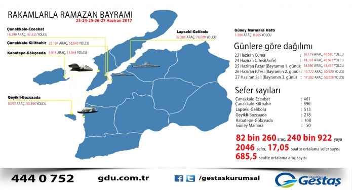 Ramazan Bayramı tatili geride kalırken tam 82 bin 260 araç ve 240 bin 922 yaya Boğaz hattı, adalar hattı ve Güney Marmara hattında GESTAŞ gemilerini kullandı. Bayram tatili 4 gün olmasına rağmen Çanakkale’ye yoğun bir tatilci akını olurken bu yoğunluk, GESTAŞ Deniz Ulaşım’ın taşıma rakamlarına da yansıdı. GESTAŞ, Cuma günü de dahil edildiğinde 5 günlük süreçte tam 82 bin 260 araç taşıdı. 23 Haziran Cuma, 24 Haziran Cumartesi, 25 Haziran Pazar, 26 Haziran Pazartesi ve 27 Haziran Salı günkü geçiş verilerine bakıldığında Cuma günü 16 bin 119, Arife günü 18 bin 392, Bayramın 1. Günü 14 bin 596, Bayramın ikinci günü 15 bin 772, bayramın 3. Günü 17 bin 382 adet araç her iki yakadan geçiş sağladı. 32 bin 508 adetle Gelibolu-Lapseki hattı, Boğaz geçişinde en çok tercih edilen hat olurken Çanakkale-Kilitbahir hattı 22 bin 104, Çanakkale-Eceabat hattında 16 bin 249 araç taşındı.