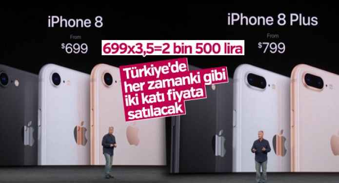 Gelelim Türkiye fiyatlarının tahmini olarak ne olacağına. iPhone 8 fiyatını güncel dolar kuru ile TL ye çevirdiğimizde 2405 TL ediyor. Bu fiyata %10 TRT bandrolu ve %25 ÖTV ekledikten sonra genel toplama %18 KDVekliyoruz ve elde ettiğimiz fiyat 3830 TL.