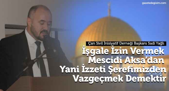 Çan Sivil İnisiyatif Derneği başkanı Sadi Yağlı son günlerde İsrail in, Filistin halkı ve Mescid-i Aksa ya müdahalesine basın açıklaması yaparak tepki gösterdi. Yağlı “Yapılan bu işgal ve zulümlere sessiz kalmak İsrail gibi bir terör örgütünü cesaretlendirip Kudüs’ü İsrail terör örgütünün başkenti ilan etmesine izin vermek ve Kudüs’ten, Mescidi Aksa’dan yani izzeti şerefimizden vazgeçmek demektir” dedi.