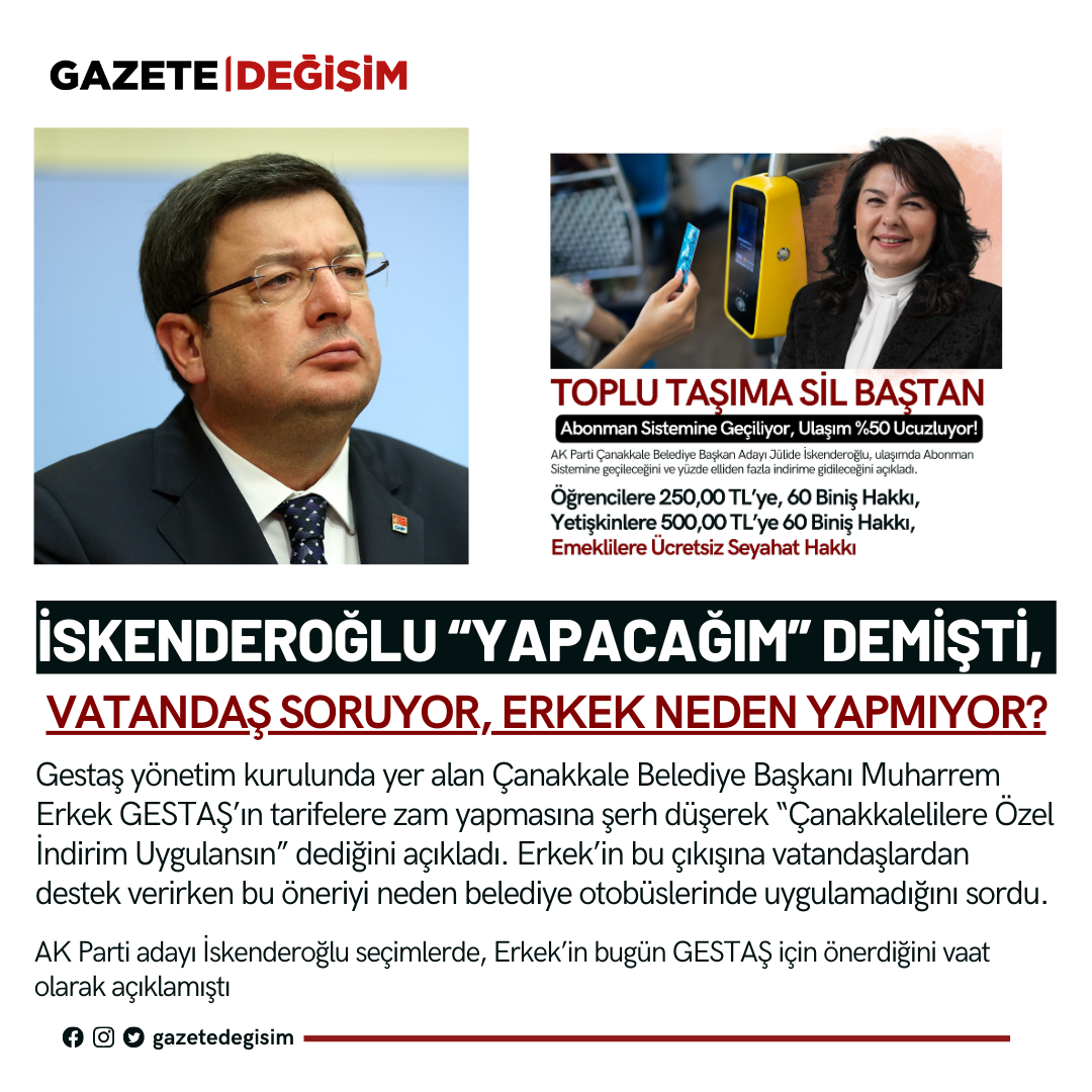 1915 Çanakkale Köprüsü geçiş ücretleri ve GESTAŞ’ın fiyat artışları sonrası Çanakkale Belediye Başkanı Muharrem Erkek, Çanakkale’de yaşayan vatandaşlar için özel tarifeler önerdi. Erkek, “GESTAŞ’a zam konusunda şerh koyduk, ancak asıl sorun maliyetleri düşürmek ve alım gücünü artırmak. Çanakkale il sınırları içinde yaşayan hemşerilerimiz için özel bir uygulama yapabiliriz, bunu ilk toplantıda gündeme getireceğiz” dedi. Bu öneriyi destekliyor ve bir adım daha ileri gidiyorum: Erkek, bu uygulamayı Çanakkale'deki toplu ulaşımda da yapmalı. Öğrenciler için Ankara’da 30 gün sınırsız biniş abonman kartı 250 TL, İstanbul’da ise 220 TL iken, Çanakkale’de abonman sistemi neden yok? Sayın Erkek’in bu önerisini İYİ Parti ve AK Parti gruplarının da ilk meclis toplantısında dile getirmelerini bir fırsat olarak görüyorum. Abonman önerisi AK Parti adayı Jülide İskenderoğlu tarafından seçimlerde gündeme getirilmişti.