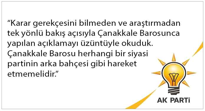 Baroların muhalif bir kimlikte olmasından rahatsızlık duyulmadığı da belirtilen açıklamada, “Kararı beğenmeyebilir yerinde bulmayabilirsiniz bunlar anlaşılabilir, tartışılabilir tercihlerdir. Kimse baroların muhalif bir kimlikte olmasından rahatsız değildir. Ancak Barolar sadece muhalif olamazlar aynı zamanda çok yönlü ve objektif olma zorunluluğu da vardır. Muhaliflik başka bir şey, siyasi parti tarafı olmak başka bir şeydir. Çanakkale Barosu, siyasi düşüncesi bulunmayan veya farklı siyasi düşüncelere sahip üyeleri olan bir meslek örgütüdür. Bir yargı mercii de değildir. Ayrıca; Çanakkale'de, Ak Parti aleyhine gelişen olay ve kararlara sessiz kalan Çanakkale Barosu'nun, sınırları dışındaki İstanbul Seçimlerine ilişkin alınmış olan karara karşı bu şekilde bir açıklama yapmış olması siyasi taraf olduğunun vurgulanması mıdır? Ayrıca her hukukçu bilir ki olayların değerlendirilmesinde farklı görüşler yargı kararlarında da oluşabilmektedir. Siyasi düşüncesi bulunmayan veya farklı siyasi düşüncelere sahip üyeleri olan bir meslek örgütünün tarafsızlığını yitirerek, hukukçu kimliğinden uzak bir şekilde böyle bir açıklama yapmış olması tarihe ve farklı düşünen üyelerinin kalbine KARA LEKE olarak düşmüştür. Kıymetli Baromuz seçim dönemi konusunda fikir paylaşımına öncelikle Çanakkale'den başlamalıdır. Örneğin; Ayvacık Küçükkuyu seçimlerinde, askı listelerine yaptığımız vaki itirazda, devletin resmi organlarının tespitlerini, yorum yoluyla değerlendirme dışı bırakan, üstelik buna, "sürenin bitmesine 25 dakika kala itiraz edildiği" gibi bizim hukuk biliminde anlayamayacağımız bir gerekçe koyan İlçe Seçim Kurulu Başkanlık kararını ne yapacağız? Sayın Baromuz bu konuda Adalet ve Kalkınma Partisinin mağduriyetinin yanında mıdır? Yoksa yargı kararına saygı mı duymaktadır? Çanakkale Küçükkuyu için bu karar bir kara leke midir? Baromuzun bu soruları cevaplayacağından şüphemiz yoktur(!) Mesela Çanakkale'de riskli binaya pankart asan ve bu şekilde can ve mal güvenliğini hiçe sayan siyasi parti lehine verilen YSK kararına saygı mı duymuş, yoksa bu durumu manidar bir sessizlikle mi karşılamıştır? Bu konuda bir fikri ve zikri var mıdır? Ayrıca ifade edilmesi gereken husus İstanbul seçimlerine ilişkin verilen kararın sandık olduğudur. Bütün hakların kaynağı millet iradesidir. Son sözü millet söyleyecektir. Çanakkale Barosu istemese de biz millete inanmaya devam edeceğiz” ifadelerine yer verildi.
