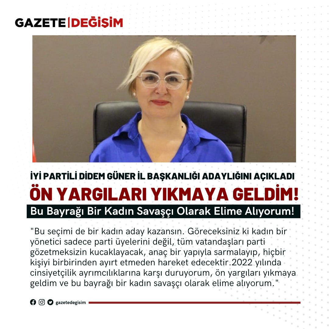 İYİ Parti il başkanlığına talip olan Belediye Meclis Üyesi Didem Güner, parti binasında düzenlediği basın toplantısında adaylığını ilan ederek, açıklamalarda bulundu. İYİ Parti’nin umulmadık bir zamanda, umulmadık bir yerlerden çıkıp gelen cesurların öyküsü olduğunu ifade ederek sözlerine başlayan Güner, “İYİ Parti’nin adı Oğuzların 24 boyundan biri olan Kayı Boyu’nun bayrağından esin almıştır. Kayı kelime anlam, olarak ‘kuvvet ve kudret sahibi’ anlamına gelmektedir. Logomuzdaki güneş ve etrafındaki sekiz çizgi, ilkelerimiz olan; umut, kararlılık, adalet, gelecek, bilgi, zenginlik, cesaret ve medeniyeti temsil eder. Bu anlamda biz İYİ Partililer halkımıza kuvvet ve kudret olurken, onlara umudu, kararlılığı, adaleti, cesareti ve medeniyeti getirmek için yola çıkmış gönüllüleriz. Çok Kıymetli Genel Başkanımız Sayın Meral Akşener’in liderliğinde, İYİ Bir Türkiye için millet bizi çağırıyor diyerek yola çıktık. Çünkü milletimiz bugün her alanda fakirleşen, özgürlükleri her alanda kısıtlanan, her alanda krizlere sürüklendiği bu anlayıştan; amasız, fakatsız, lakinsiz derhal kurtulmak istiyor. Çünkü milletimiz artık kadın cinayetlerini duymak istemiyor, yoksullukla mücadele etmek istemiyor. Çünkü basın artık özgürce yazabilmek, düşüncelerini özgürce dile getirmek istiyor. Çünkü gazeteciler, işadamları, vatandaşlar siyasi yorum yaparak hapislere atılmaktan korkarak yaşamak istemiyor” dedi.