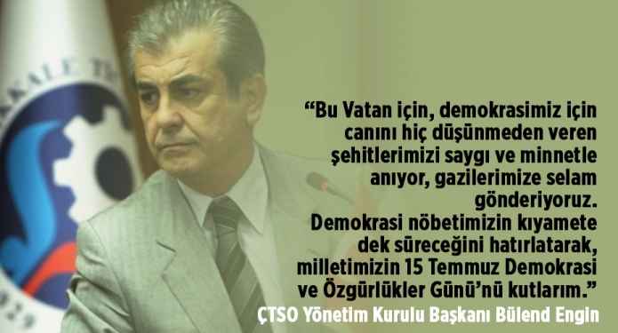 ÇTSO Yönetim Kurulu Başkanı Bülend Engin, 15 Temmuz Demokrasi ve Özgürlükler Günü dolayısıyla yazılı bir basın açıklaması yaptı. 15 Temmuz Demokrasi ve Özgürlükler Günü dolayısıyla açıklama yapan ÇTSO Yönetim Kurulu Başkanı Bülend Engin, “Kıyamete dek demokrasi nöbetindeyiz” diyerek başladığı açıklamasına şöyle devam etti; “Türkiye Cumhuriyeti 29 Ekim 1923’te kurulmadan önce Türk milleti yedi düvele karşı kanını canını ortaya koyarak Kurtuluş Savaşı destanını yazdı. Türk milleti Kurtuluş Savaşı’nda 7’den 77’ye kadınıyla erkeğiyle hürriyet ve bağımsızlık aşkını bütün dünyaya haykırdı.
