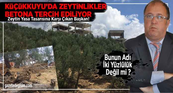 Geçtiğimiz günlerde TBMM den geri çekilen yasa ile zeytinliklerde şimdilik sanayi yapılaşmalarının önüne geçildi. Ancak zeytinlikler yazlık villalara kurban edilmeye devam ediliyor. Sahil bandında zeytinlikler içinde gerek yasalara uygun şekilde yapılmış, gerekse kaçak olarak inşa edilen yazlıklar tepki çekiyor.. Tasarıya en çok tepki gösteren isimlerden olan Küçükkuyu Belediye Başkanı Cengiz Balkan’ın başkanlığında Küçükkuyu verilen imarlarla adeta talan ediliyor. Balkan; “Zeytinimizden elinizi çekin. Sağlıklı beslenme, istihdam yaratma başta olmak üzere sayısız fayda sağlayan bu kutsal ürünümüzü korumak için her türlü mücadele yöntemine başvuracağız..” demişti ama Küçükkuyu belediyesinin verdiği izinlerle ilçede zeytinlikler adeta betona tercih ediliyor.