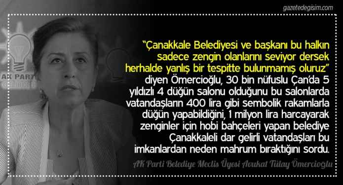 Çanakkale Belediyesi 2017 Temmuz ayı meclis toplantısı gerçekleştirildi. Toplantıya AK Parti Grubu adına konuşan Avukat Tülay Ömercioğlu’nun söyledikleri damgasını vurdu. Ömercioğlu, CHP’nin adalet yürüyüşünden, belediye başkanı Gökhan’ın “tecavüzcü coşkun gibi oldular” beyanındaki üslup sorununa, İl başkanı Yeşim Karadağ’ı hedef alan ithamlardan, dar gelirli vatandaşlar için yapılması istenen düğün salonuna kadar birçok önemli konuyu gündeme getirdi.