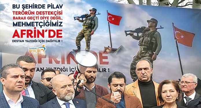 Ak Parti Çanakkale İl Gençlik Kolları Başkanlığı, şehitler ve Afrin zaferi için mevlit okutup, pilav dağıttı. Pilav dağıtım standındaki , “Bu şehirde pilav terörün destekçisi barajı geçti diye değil, Mehmetçiğimiz Afrin’de destan yazdığı için dağıtılır!” yazılı afiş dikkat çekti. Ak Parti Çanakkale İl Gençlik Kolları Başkanlığı, şehitler ve Afrin zaferi için mevlit okutup, pilav dağıttı. Pilav dağıtım standındaki , “Bu şehirde pilav terörün destekçisi barajı geçti diye değil, Mehmetçiğimiz Afrin’de destan yazdığı için dağıtılır!” yazılı afiş dikkat çekti. Ak Parti gençlik Kolları bu afişiyle Belediye Başkanı Ülgür Gökhan’a göndermede bulundu. Gençlik Kolları Başkanı Burak Balık, konuşmasında ayrıca, CHP Genel Başkanı Kemal Kılıçdaroğlu ile CHP Genel Başkan Yardımcısı ve Çanakkale Milletvekili Av. Muharrem Erkek’e de gönderme yaptı.