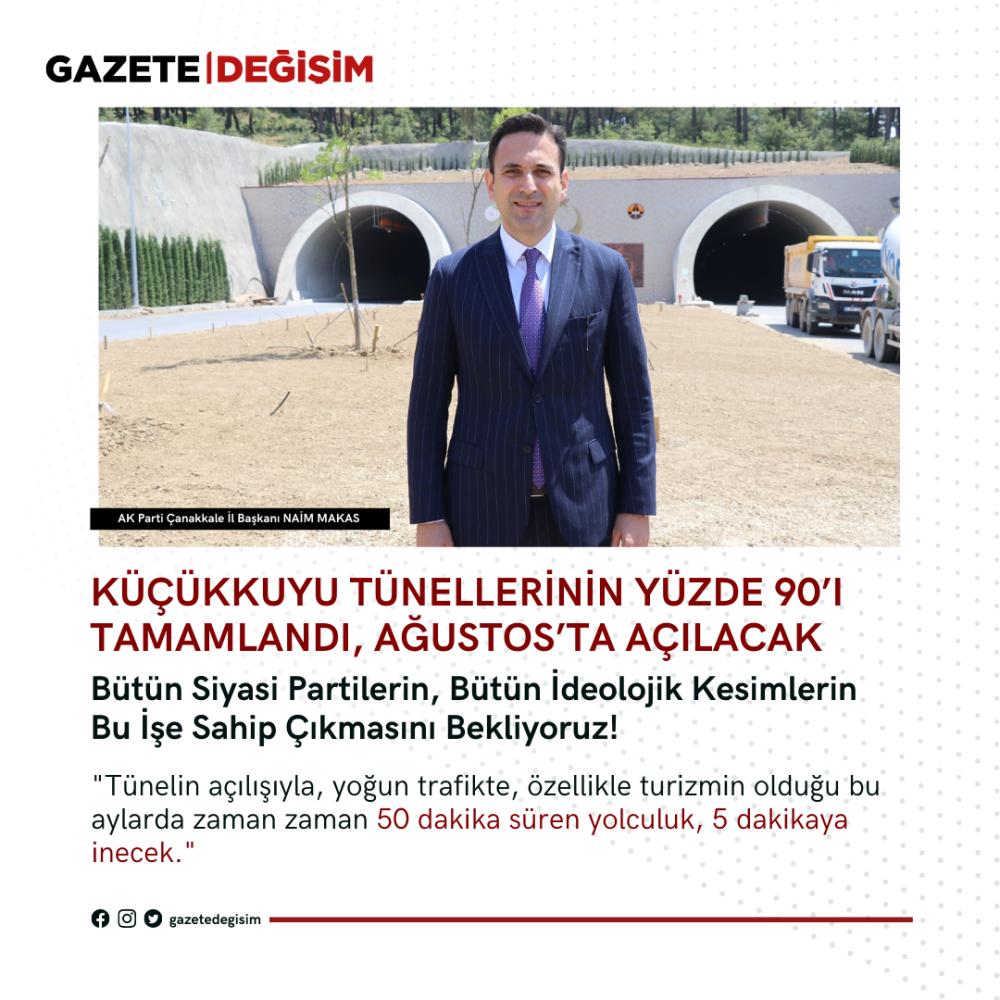 AK Parti İl Başkanı Naim Makas, tünellerin ağustos ayında hizmete açılacağı müjdesini vererek, "Bu tüneller 1700 metre ve 4 bin 17 metre olmak üzere toplam yaklaşık 6 kilometreye yakın 1 uzunluk teşkil ediyor. Her 1 etap 2'şer tünelden meydana geliyor. Burada gidiş geliş olarak toplamda 12 kilometrelik kara yolu tüneli yapısından bahsediyoruz. Bu tüneller Marmara bölgesinin en uzun tünelleri. Bu yıl Cumhurbaşkanı'mız Recep Tayyip Erdoğan, 2 bin 23 metreyle en uzun orta açıklığa sahip '1915 Çanakkale Köprüsü'nün açılışını yaptı. Dünyanın en büyük köprüsünün Ege'ye ve Akdeniz'e açılan kapısı adeta Küçükkuyu tünelleri. 1 yıl içinde Çanakkale'mizde ulaşımın konforunu artırmak, vatandaşımıza hizmet etmek adına gerekli olan ne varsa 2'nci kez hayata geçti. Biz bu anlamıyla ne kadar gurur duysak, ne kadar övünsek azdır. Burada 24 saat çalışma esasına göre 600 personel alnının terini akıtmaktadır. Yine aynı şekilde 160 makine ve ekipman burada hizmet vermektedir. Tünelin açılışıyla beraber yoğun trafikte, özellikle turizmin olduğu bu aylarda zaman zaman 50 dakika süren bu yolculuk 5 dakikaya inecek. Zamandan tasarruf, iş gücünden tasarruf, akaryakıttan tasarruf. Araçlardan çıkan emisyon açısından çevreye verilen zarar çok daha az olacak. Projenin her yönüyle bu anlamda bir kazanım olduğunu düşünüyorum. Bütün siyasi partilerin, bütün ideolojik kesimlerin bu işe sahip çıkmasını bekliyoruz. Çünkü bu projeler, milletin projesi. Bu projeler AK Parti hükümetleri dönemlerinde milletimizin kendi ferasetiyle sorumluluk verdiği yönetimlerin, kadroların hayata geçirdiği projeler" diye konuştu.