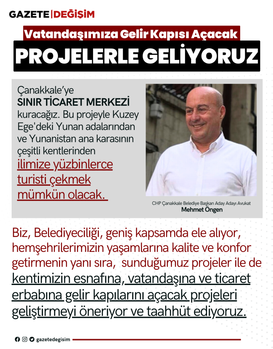 O projelerden en dikkat çekeni ise Çanakkale’ye Sınır Ticaret Merkezi kurulması projesi oldu. CHP Çanakkale Belediye Başkan Aday Adayı Av. Mehmet Öngen, belediye başkanı seçilmesi halinde kente sınır ticaret merkezi kurulacağını açıkladı. Öngen, yaptığı açıklamada, 2009 yılında yayınlanan Bakanlar Kurulu kararı ile Doğu ve Güneydoğu Anadolu'daki 13 ilin komşularla ticaretinin önünün açıldığını hatırlattı. Bu illerde komşu ticareti sayesinde tarihi rekorlar kırıldığını belirten Öngen, Çanakkale'nin de benzer bir projeden yararlanabileceğini söyledi.